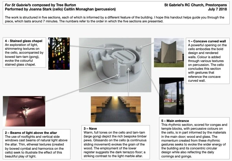 The powerful opening on the cello embodies the bold design of the church and the concrete rendered walls. Colour is added through various textures on percussion while the cello concludes the section with gestures that reference the concave curved wall at the west end of the building.